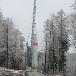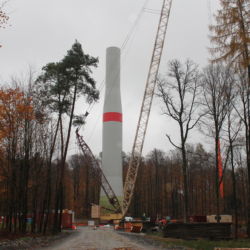 Der erste Turm befindet sich gerade im Bau. Es handelt sich um einen Hybridturm, d.h. er besteht aus Beton- und Stahlsegmenten. Ein Turm besteht aus 29 einzelnen Betonröhren und 4 Stahlrohren. Die Betonröhren werden in Halbschalen angeliefert und vor Ort zusammengeschraubt. Danach werden die Turmteile aufeinandergesetzt und durch Stahlseile mit dem Fundament verspannt.