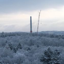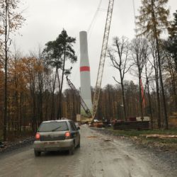 Der Hybridturm besteht aus Beton und Stahlsegmenten. Die Betonteile sind an den ersten beiden Türme nun gestellt und von innen mit Drahtseilen nach unten mit dem Fundament verspannt. Die Kräne sind nun an den beiden anderen Standorten aufgebaut worden.