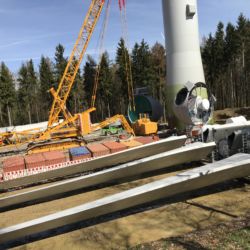 Nachdem die Erdarbeiten schon im Dezember begonnen hatten sind in dieser Woche das Betriebsgebäude sowie die Betonwanne des Transformators gesetzt worden. Für die Schwerlastfahrzeuge, die von der Gemeindeverbindunsstraße Altheim – Waldstetten kamen, ist der vorhandene Waldweg ausgebaut worden.